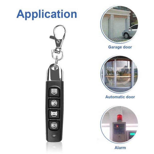 - Kopijavimas: Kairėje rankoje laikykite originalų pultelį, dešinėje – mūsų kopijuoklį ir laikykite abu pultelius kuo arčiau vienas kito; vienu metu paspauskite pirmuosius abiejų pultelių mygtukus; per maždaug 2 sekundes LED lemputė greitai sumirksės 2 kartus; po vienos sekundės indikatoriaus lemputė mirksi nuolat, tada atleiskite pirštus; ir tada paspauskite klavišą, po sėkmingo susiejimo lemputė šviečia nuolat, o tai reiškia, kad pirmojo klavišo kodas iš originalaus pultelio buvo nukopijuotas į kitą pultelį; tas pats metodas gali būti naudojamas paeiliui antrajam, trečiajam klavišui… Jei kopijavimas sėkmingas, pultelio funkcija yra tokia pati kaip originalo.