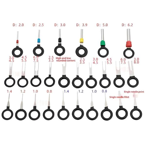 Komplekte yra skirtingų dydžių viengubų ir dvigubų kaiščių ištraukimo ir liejimo įrankiai, užtikrinantys suderinamumą su įvairiomis jungtimis – tiek automobiliuose, tiek elektroniniuose prietaisuose.